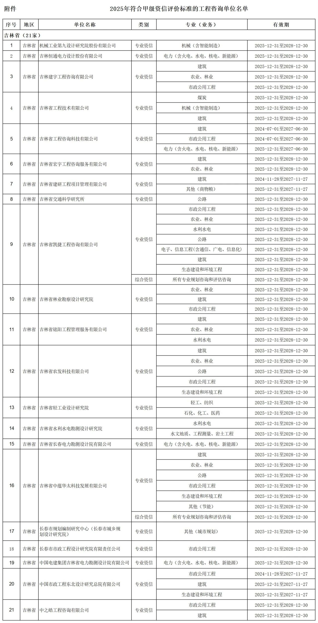 2025年12月31日,中国工程咨询协会发布2025年符合甲级资信评价标准的工程咨询单位名单。吉林省有21家工程咨询单位符合甲级资信评价标准,其中吉林省凯捷工程咨询有限公司持续符合综合甲级,吉林省中蕴华太科技发展有限公司新入围综合甲级。截至目前,吉林省本省共有52家甲级单位,其中综合甲级单位4家,甲级单位48家。